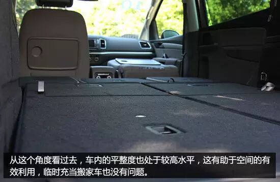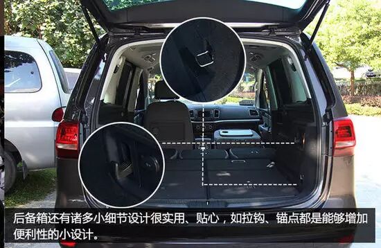 夏朗的第二排座椅还可以灵活调整,每个座椅都可以单独向前向后。当第三排座椅放倒后,夏朗的后备箱地板非常平整, 此时的空间也是较为惊人。后备箱还有诸多小细节,如拉钩、锚点比较实用。由于第三排座椅占用的过多的空间,夏朗并没有配备胎,只有一套换胎工具,这多少有些遗憾。