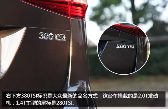 车尾的变化并不大,依旧保持着饱满稳重的风格,但在细节更符合潮流。尾灯组与时俱进增添了LED光源,并且点亮之后视觉效果不错,夜间辨识度也更高。右下方380TSI标识是大众最新的命名方式,这台车搭载的是2.0T发动机,1.4T车型的尾标是280TSI。夏朗的倒车影像摄像头并未在尾部LOGO,而是在传统的拍照架上方,排气管为隐藏式双边双出设计。