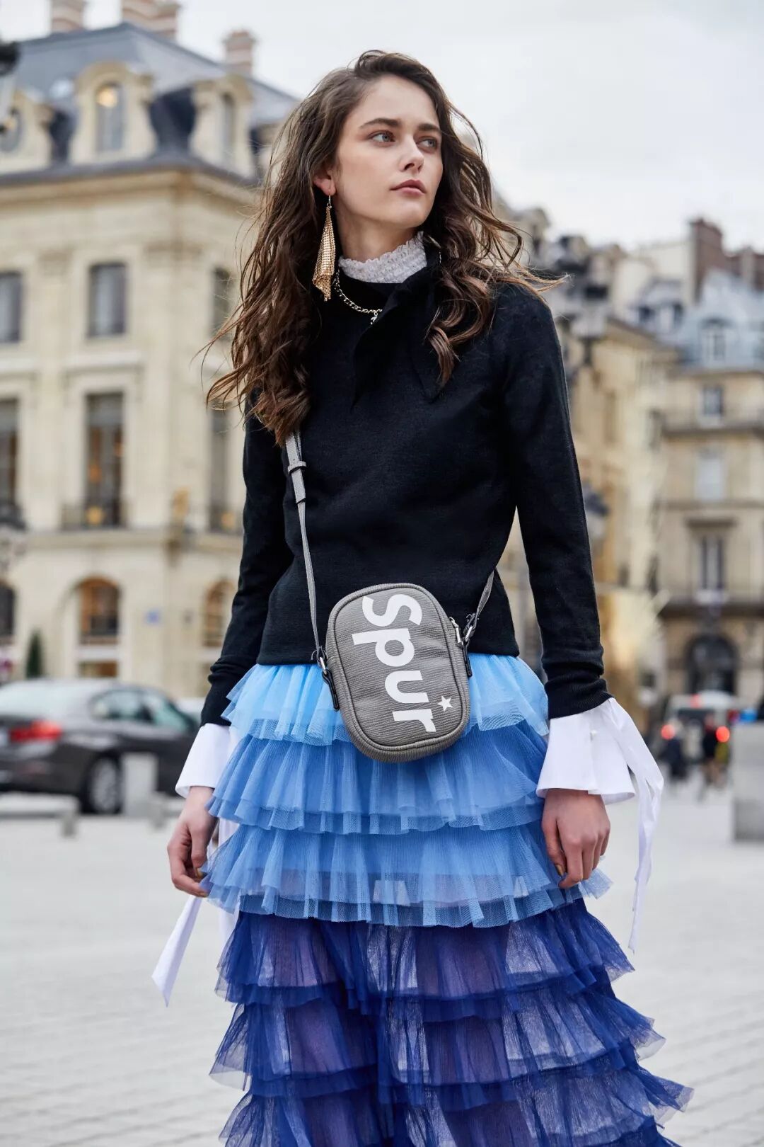 同样是毛织跟半裙搭配,这款渐变色蛋糕裙为简约造型提供视线焦点。