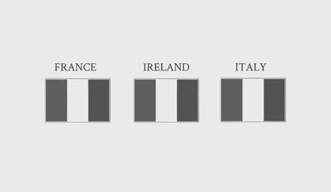 他眼中的法国、爱尔兰、意大利国旗是酱紫的。