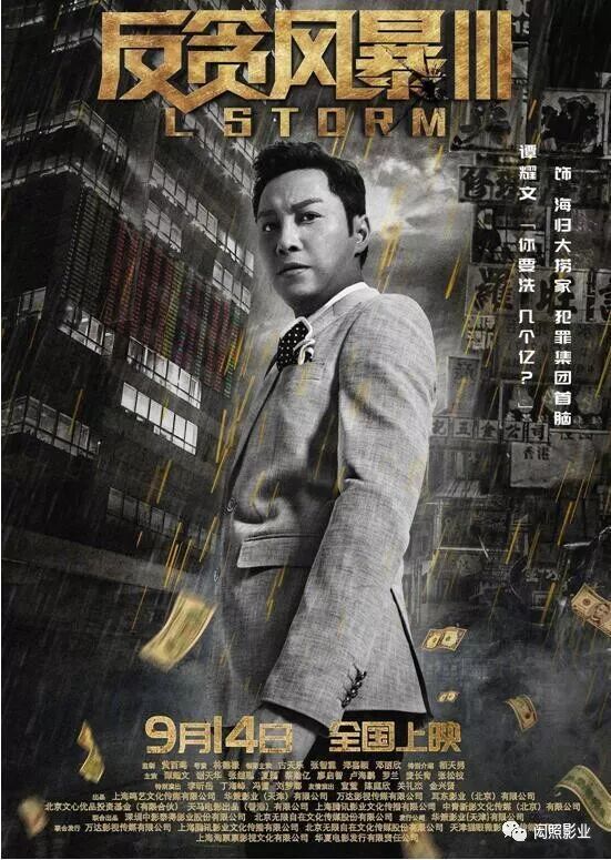 公布的个人版海报中以灰色为主色调,从天而降的黄金雨拍打着欲望之城,预示着金钱与欲望交织,人性与信仰的对垒。谭耀文版个人海报中,不同于古天乐背后的廉政公署,张智霖背后的耸立高楼,谭耀文背后灰色楼宇中的交易板,是否暗示了谭耀文所饰演的角色与市场交易息息相关呢?海报中揭秘谭耀文饰演的角色是海归大捞家,犯罪集团首脑,而海报中的另外一句角色台词“你要洗 几个亿?”则更是揭示了人物命运。到底谭耀文在《反贪风暴3》中饰演的大捞家如何在黄金雨的冲刷下深陷其中,9月14日静待观众到影院寻找解答。