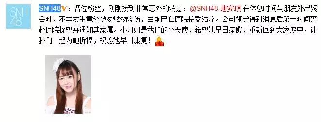 据SNH48官方微博表示,“各位粉丝,刚刚收到非常意外的消息:唐安琪在休息时间与朋友外出聚会时,不幸发生意外被易燃物烧伤,目前已在医院接受治疗。公司领导得到消息后第一时间奔赴医院探望并通知其家属。小姐姐是我们的小天使,希望她早日痊愈,重新回到大家庭中。让我们其为她祈福,祝愿她早日康复!”