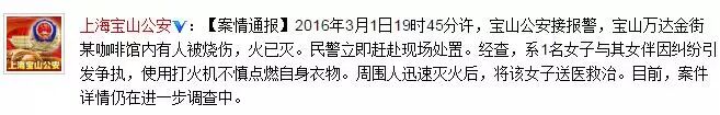 3月2日中午12:11分,“上海宝山公安”官方微博发文疑似直指此事,“2016年3月1日19时45分许,宝山公安接报警,宝山万达金街某咖啡馆内有人被烧伤,火已灭。民警立即赶赴现场处置。经查,系1名女子与其女伴因纠纷引发争执,使用打火机不慎点燃自身衣服。周围人迅速灭火后,将该女子送医救治。目前,案件详情仍在进一步调查中。”