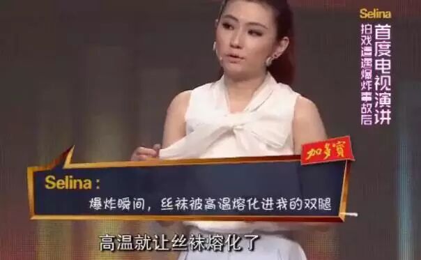 Selina会有如此严重的烧伤,和她拍摄时腿上穿了易燃的丝袜有很有关系。Selina后来在《开讲啦》中有讲过,爆炸的瞬间,高温让丝袜融化了,造成了更深度的灼伤。