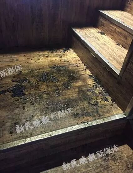 不过,据记者在现场观察,楼梯上有非常明显的火灾过后痕迹,而二楼就餐区地面上有斑驳的焦痕,纸巾、杯具散落在桌上、地面上。