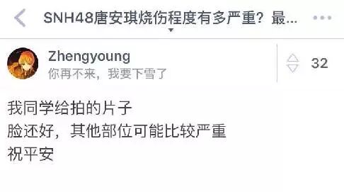 从公安微博来看,唐安琪应是与女伴发生纠纷引发争执,使用打火机不慎点燃自身衣物所致。带着这一疑问,腾讯娱乐再次采访SNH48方工作人员,对方坦言:“真实原因只有她本人知道,但她现在已经不能说话了,医生说她要在ICU呆七天进行观察,若能平稳度过,才算脱离危险。”