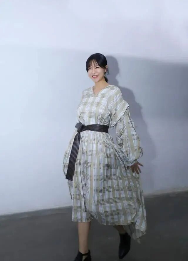 卡其色的格纹连衣长裙搭配的黑色短袖甜美优雅的同时也非常时尚大气,腰部的黑色绑带式腰带也优化了身材比例,使得腿部更显纤长,空气刘海搭配低马尾也使得李艾看起来更加的恬静温柔,邻家姐姐的感觉更是使人不禁心生好感。