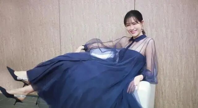 胸前与袖部的薄纱设计使得白皙的肌肤与完美的身材曲线若隐若现,这样的朦胧感为李艾增添了一丝别样的性感撩人,灯笼袖的薄纱袖部更是看起来少女甜美又带着一丝复古气息,深蓝色也衬得李艾的肌肤愈发白皙细腻,整个人简直白到发光,一双小猫跟的尖头黑色高跟鞋也是极具妩媚的气质,整个人看起来哪里像是四十多岁的样子,说是二八少女也不为过。