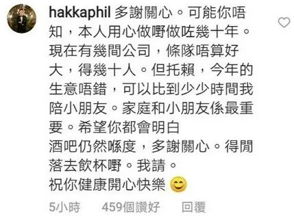 “多谢关心,可能你不知道,本人用心做事几十年,现在有开几间公司,今年的生意不错,可以有时间陪小朋友,家庭和小朋友是最重要。”