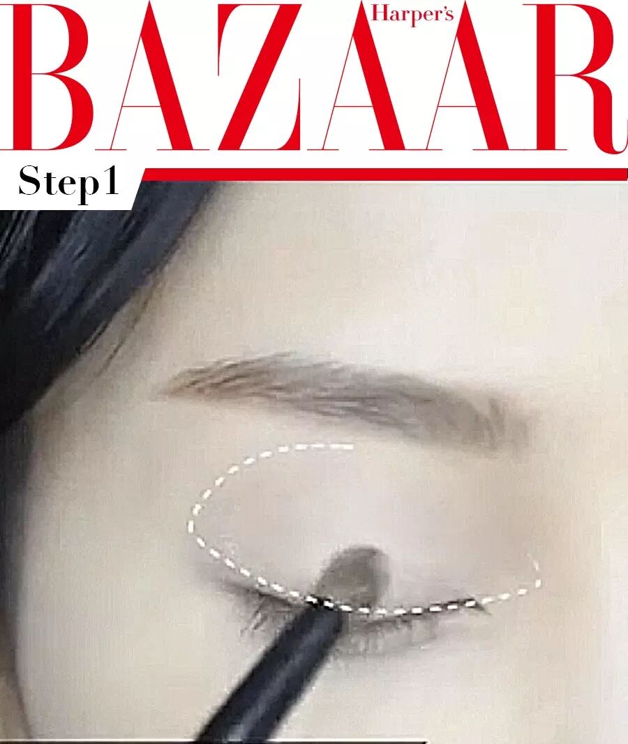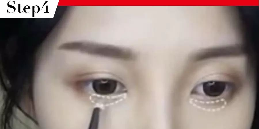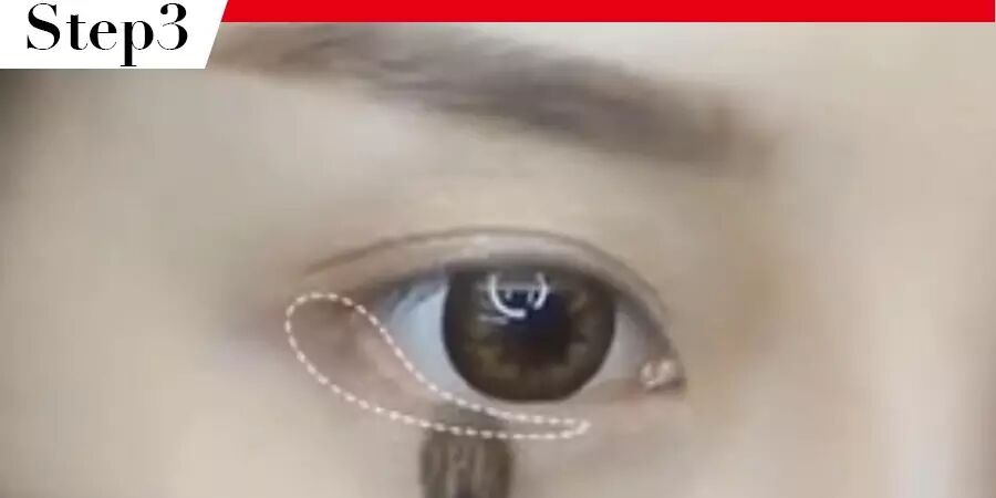 然后,在上眼尾虚线的位置涂上棕色眼影加深眼尾轮廓!