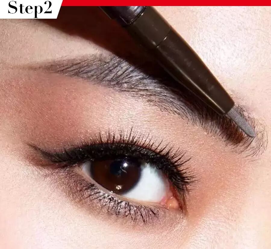 首先,用眉笔从眉头到眉尾描出眉型,在描绘眉尾的时候要注意相较眉头处轻轻抬起25度!