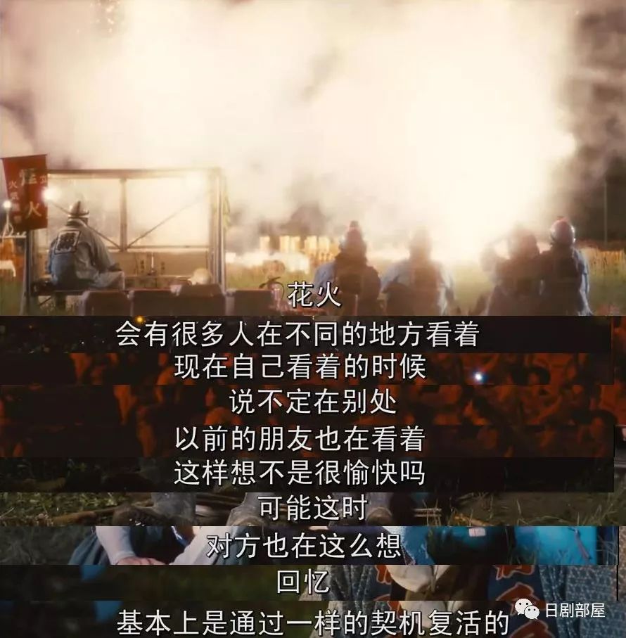 竹内结子饰演的是主角的前女友,部屋君最难忘的片段是当烟花在天空中爆炸,火焰点亮了夜空。镜头切到主角的回忆,也是一个放烟花的夜晚,青柳与前女友在烟花下接吻……