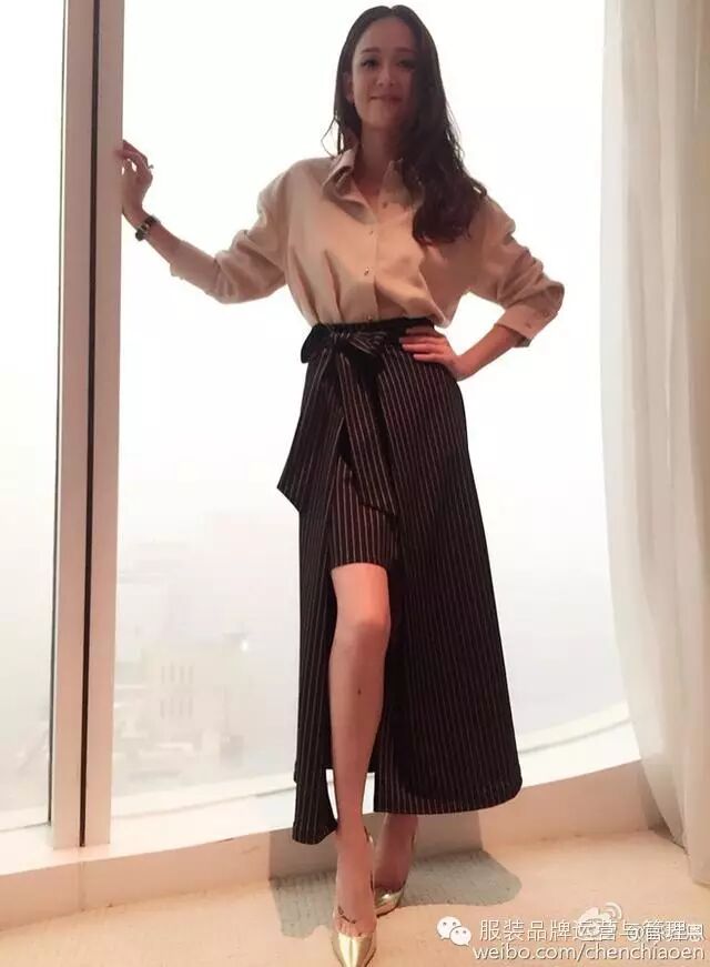 白色衬衫+条纹不规则长裙,露出大长腿十分抢眼。像这样把衬衫松松的扎在下装里是陈乔恩很喜欢的穿法,也被她穿的美出了新高度。