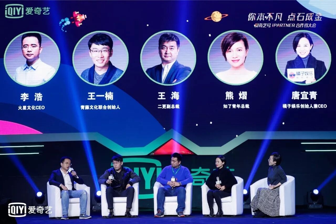 论坛环节由火星文化CEO李浩主持,邀请到了青藤文化联合创始人王一楠、二更视频副总裁王海、橘子娱乐创始人&CEO唐宜青、知了青年总裁熊熠4位嘉宾,就“原创CP的不凡之路”这个主题发表了各自的看法,分别从原创、商业变现、IP衍生三个方面分享了各自过去的经验和未来的方向。此外,爱奇艺还颁发出“网络大电影奖项”、“网络电视剧奖项”、“原创CP奖项”等25项大奖,鼓励和激发优秀的爱奇艺号内容创作者。