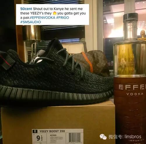 Fif在他的IG上晒出鞋子,他礼尚往来地为Ye做宣传,shout out了Ye,也叫歌迷去搞一双。旁边放了一瓶Fif天天宣传的EFFEN伏特加。