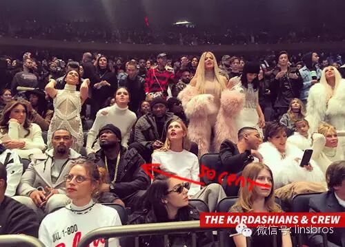 更新,Ye不但送鞋给50 Cent,且邀请Fif到麦迪逊花园广场看他的Yeezy Season 3服装产品线发布会,座位就在Kanye家人/卡戴珊家族区域,这个位置是最尊贵的,Fif也是当天最重量级的大腕,Ye和Fif两人相互给足对方对方面子,不错。