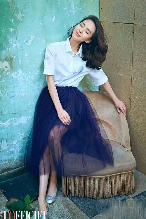 浅蓝色衬衫配黑色纱裙,简洁大方,尽显文艺范和唯美气质。