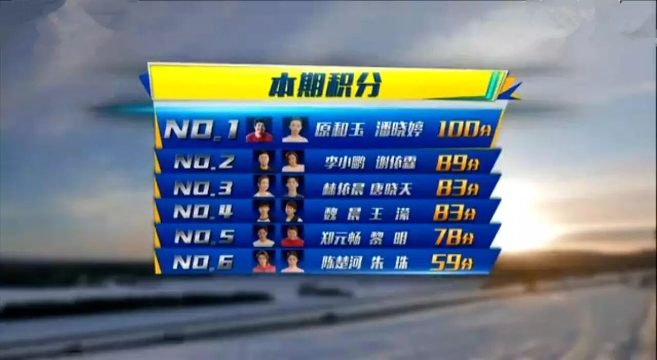 李小鹏和谢依霖的反差CP竟然默契又幸运,即使被王濛和魏晨强制制动20分钟仍拿下第二名的好成绩。林依晨和唐晓天在被抢走最心仪搭档郑元畅之后,后来居上拿下第三名逆袭成功。王濛与魏晨这样的双强组合一路领先,最终被卡在最后一关获得并列第三名,但王濛却对自己和魏晨的组合非常满意,直称这才是竞技的节奏。尽管暖男小综在半路上差点被悠哉天王黎明搞崩溃,两人最终互补互足第五名到达,小综坦言黎明大哥搭配不同的人可以有不同的节奏,期待两人之后的火花。作为唯一一组不变的搭档朱珠和陈楚河多了默契却缺少运气,排名第六垫底,网友也是对这对斗气冤家哭笑不得。
