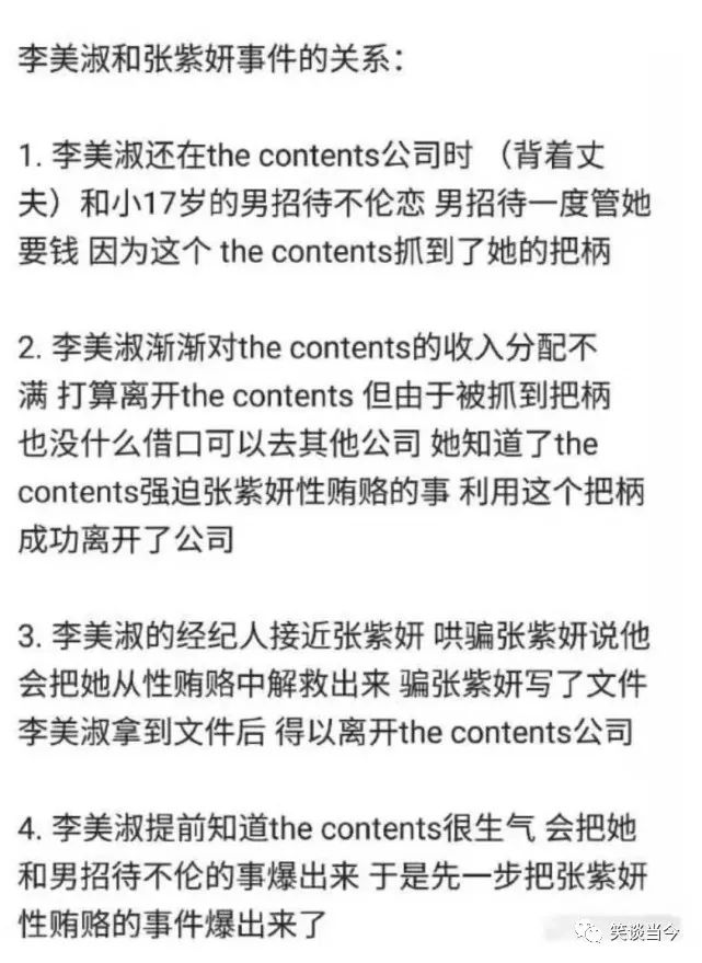 韩国媒体报道,当年李美淑因为被公司发现了自己与一名小17岁的男招待员发生“不伦恋”与经纪公司产生了纠纷,恰好这个时候张紫妍也因为被强迫性招待的行为想要与公司解约,得知这件事情后李美淑就联手李长浩怂恿张紫妍把平时被经纪公司强迫陪酒陪睡的事情和相关人名整理出来,试图利用这份名单威胁经纪公司老板金某以达到自己的目的。