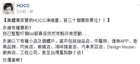 还记得兰蔻曾以安全为由取消了与何韵诗合办的小型演唱会吗?昨天(13日),何韵诗在Facebook和Instagram上同时发表长文称,兰蔻事件之后,“没有大财团敢碰我,大家怕被连累”,因此,她在社交平台发起众筹,希望香港的中小企业或个人zan助她今年10月在香港红馆开演唱会,zan助的最低门槛是1.5万港元(约合人民币1.3万元)。今天(14日)凌晨,何韵诗在Facebook上说,一天内有100个单位zan助,至少已筹到150万港元经费。