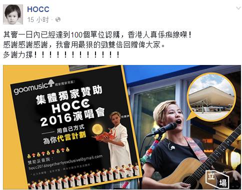 今天凌晨,何韵诗在Facebook上兴奋地说,一天之内已经有100个单位zan助,至少已经筹到了150万港元经费。