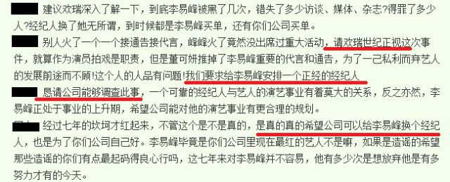 峰峰的粉丝团在微博发出长文,要求欢瑞开除李易峰经纪人杨迦茵及其团队,并恳请公司为李易峰安排一位有能力的经纪人,扭转如今的局面……
