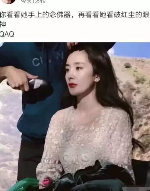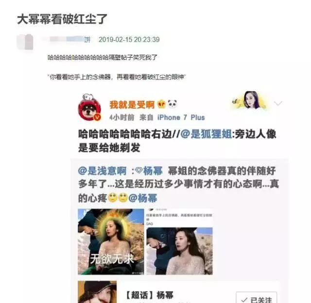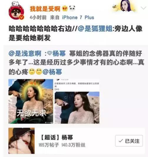 点开帖子能够看到,杨幂的粉丝利用杨幂正在做发型时的路透照,进行了PS。在她的头上P了一圈佛光,并在文中用大字写着无欲无求四个字。