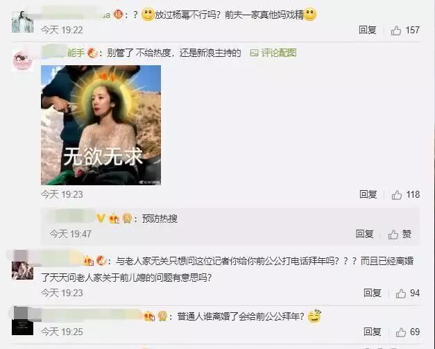 杨幂粉丝们评论到:“放过杨幂不行吗?前夫一家真他妈戏精”、“普通人谁离婚了会给前公公拜年?”、“与老人家无关只想问这位记者你给你前公公打电话拜年吗???而且已经离婚了天天问老人家关于前儿媳的问题有意思吗!”