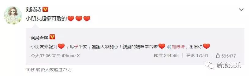 然后,两个人一大早在微博上官宣了好消息,母子平安,确实已经正式升级当爸妈了。