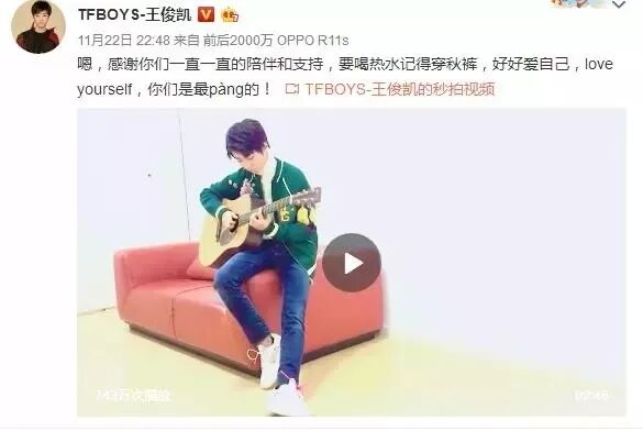 ▌王俊凯手持吉他,一身简约休闲的装扮,靠坐着沙发弹唱《love yourself》,着实有一种男友的既视感!