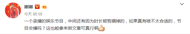 昨晚凌晨太阳女神谢娜突然发了这么一条微博:一个录播的娱乐节目,中间还有因为时长被剪辑掉的,如果真有啥不太合适的,节目会播吗?这也能拿来做文章可真行啊