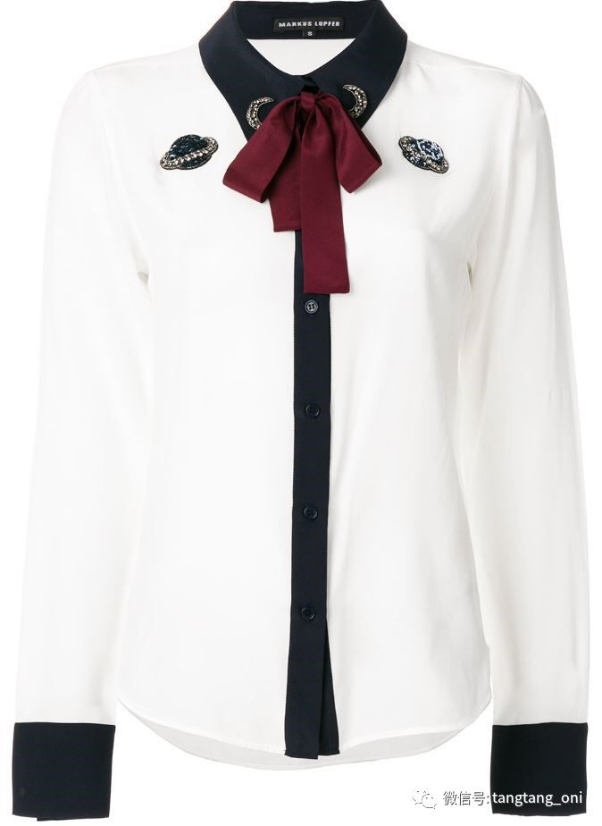 重点在于领口部分斜打了一个蝴蝶结。