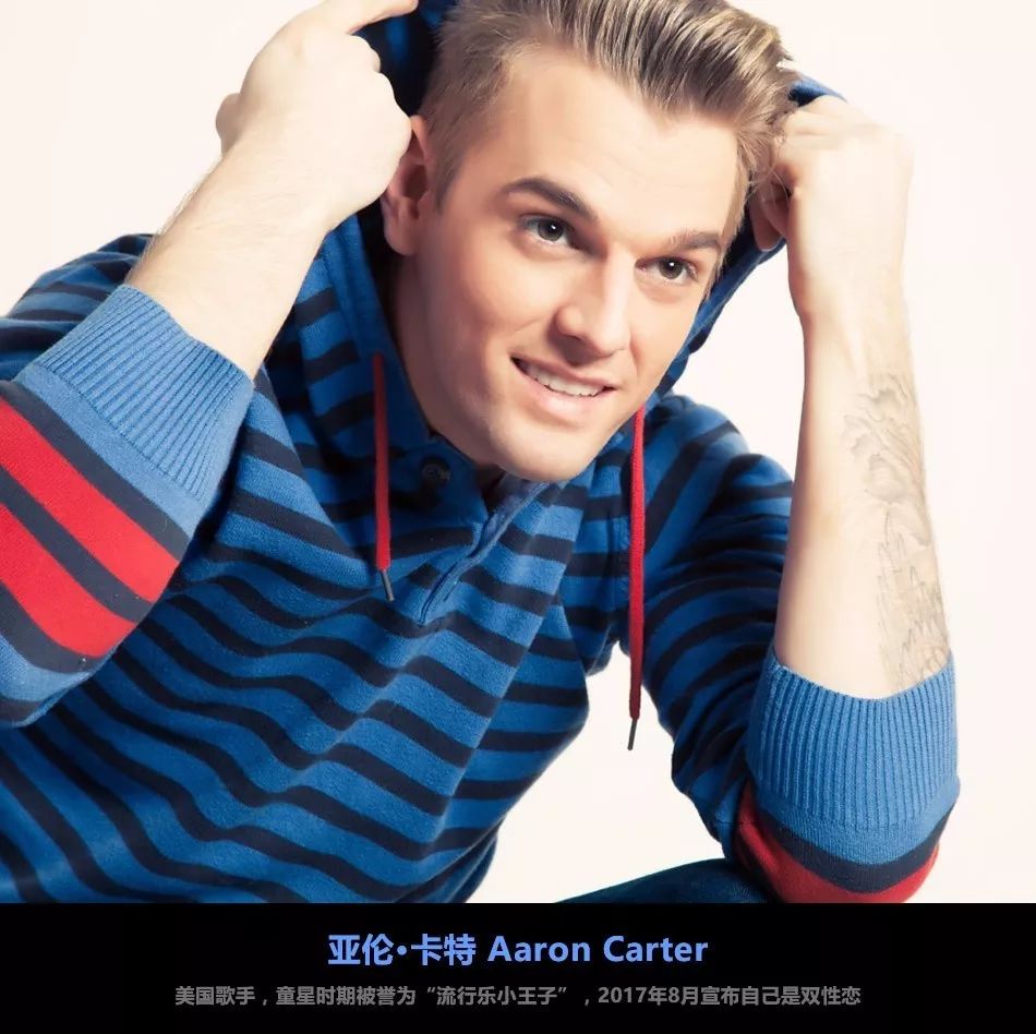 2017年8月5日,流行歌手亚伦-卡特(Aaron Carter)发推文正式出柜,宣称自己是双性恋。他称自己13岁时“开始发现对男孩和女孩都有兴趣”,“之后几年我一直在考虑这个问题,直到17岁和几个女孩谈过恋爱后,我和一起长大并合作过的一个男生有了体验。我并不以此为耻,它只是长久以来始终压在心头、我希望摆脱而后快的负担。”亚伦在出柜几天之前刚刚和女友麦迪逊-帕克(Madison Parker)分手,这可能也是促成他公开性取向的原因之一。他的发言人说,双方是自愿分手,他们依旧“彼此相爱、互相敬重”。