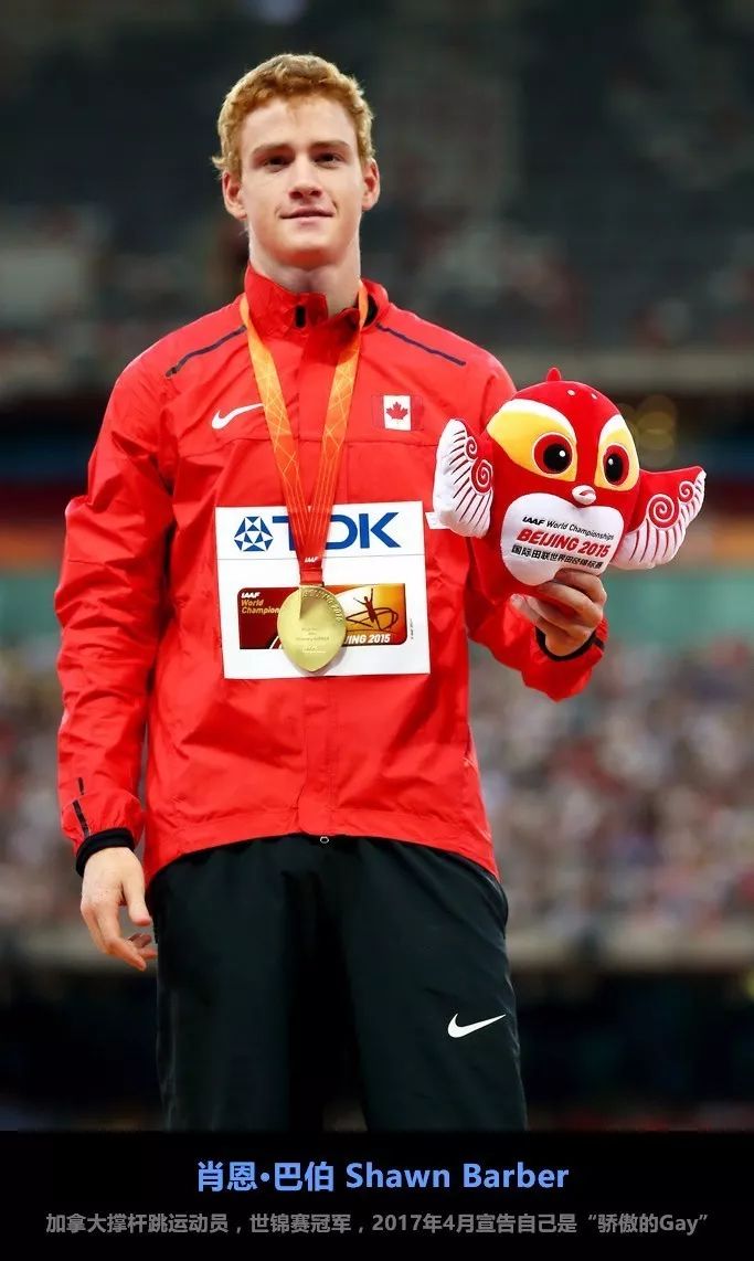 加拿大的撑杆跳高男选手肖恩纳西·巴伯(Shawn Barber)4月24日出柜公开表明他是同性恋者、并且说感到骄傲。现年23岁的巴伯曾于2015年在北京举办的国际田联世界田径锦标赛中获男子撑杆跳的冠军,他也曾参赛2016年的里约奥运会。他在脸书上低调写下:“我是同志我骄傲!感谢父母如此支持我,我会继续成长,也有很棒的亲友支持,我的父母是我最强力的支柱,最近帮我很多,我的朋友们,你们永远都是我的朋友,我也爱你们!”底下也有许多留言,表示“你是未来运动员们的榜样”、“这个世界因为你,向真正的平等更近了一步”。