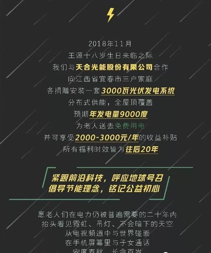 追星新姿势!——TFboys王源18岁生日公益应援:捐赠3户光伏发电系统 光伏們 内地男星 2018-11-08 22:26:13 559 创作不易,用心坚持,欢迎请BaGua喝几杯爱心咖啡!打赏并支持本文 打赏并删除本文 今天是11月8日,除了是一个不放假的节日——记者节,先祝所有记者朋友們节日快乐~还是众多00后的偶像——TFboys成员王源的18岁生日。(没错就是00后,是不是感觉自己老了哈哈哈) 而王源的粉丝們给偶像送了一份“特别”的应援——以王源的名义给三户贫困老人家装了光伏发电系统,每户3KW,20年免费用电和补贴收益。 哇,这个追星姿势厉害了,真·用爱发电啊!责任编辑:饶丽霞 创作不易,用心坚持,欢迎请BaGua喝几杯爱心咖啡!打赏并支持本文 打赏并删除本文 感谢您的支持鼓励,我会继续努力的!文章地址:用户邮箱:打赏金额:USDT 请输入数字点击”去打赏“,即可进行打赏支持本文章哦 tfboys About the Author 光伏們 功能介绍:光伏們,连接你們、我們、他們。光伏行业专业媒体,专注光伏行业内容原创。唤醒阳光,传递价值! Related Posts 追星新姿势!——TFboys王源18岁生日公益应援:捐赠3户光伏发电系统 2018-11-08 22:26:13 发表评论