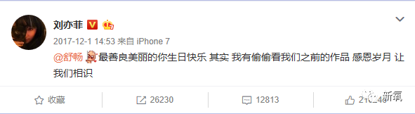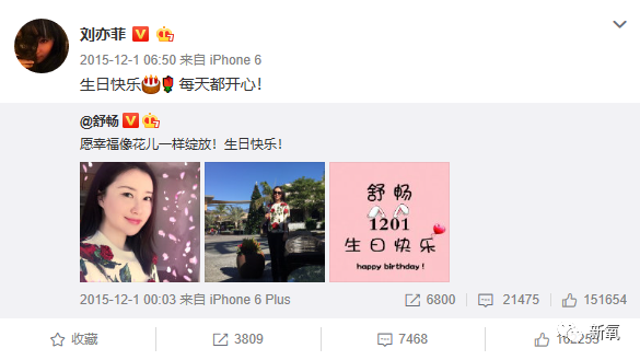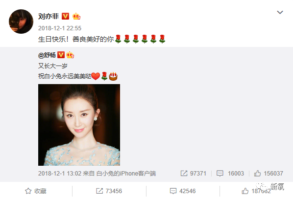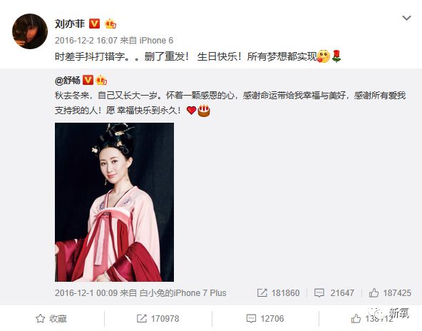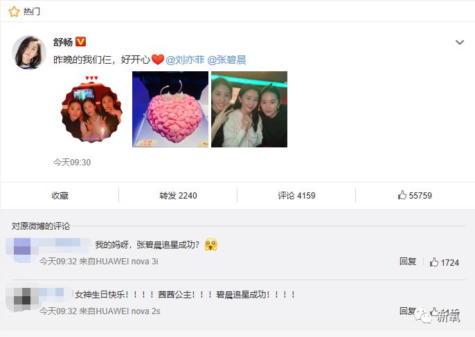 点开一看,原来是刘亦菲和张碧晨给舒畅庆生了。(莫名有些失望是怎么一回事···)
