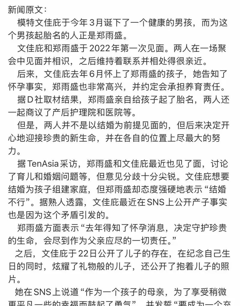 两人的相识源于2022年的几次偶遇。文佳菲是一位模特兼艺人,在2023年就有了郑雨盛的孩子,并在今年3月生产。这本该是件值得祝福的事,但郑雨盛选择了要孩子不要婚姻的处理方式,引发了大众热议。