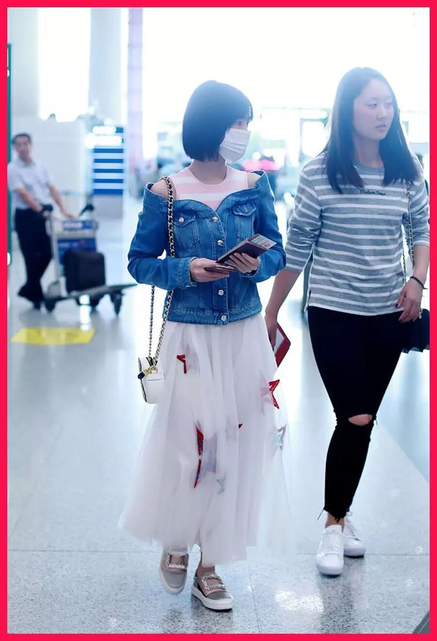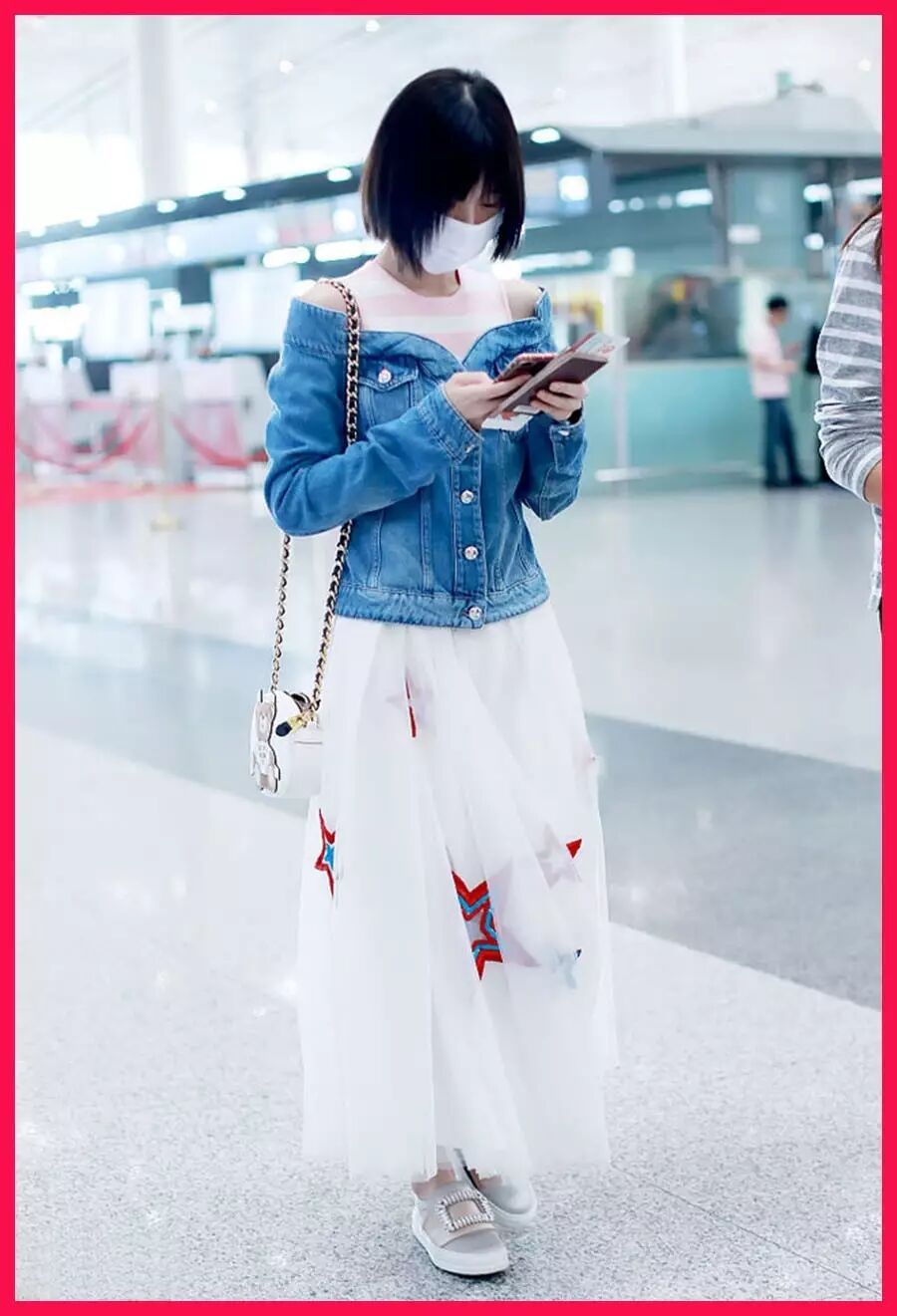 9月5日讯,北京,毛晓彤机场街拍。她戴白色口罩,身穿一字肩牛仔夹克,内搭粉白拼色条纹背心,下身穿红色五角星亮片刺绣白色长裙,脚踩Roger Vivier亮钻方扣装饰粉色丝绒厚底休闲鞋,肩背Moschino小熊拼贴链条单肩包。