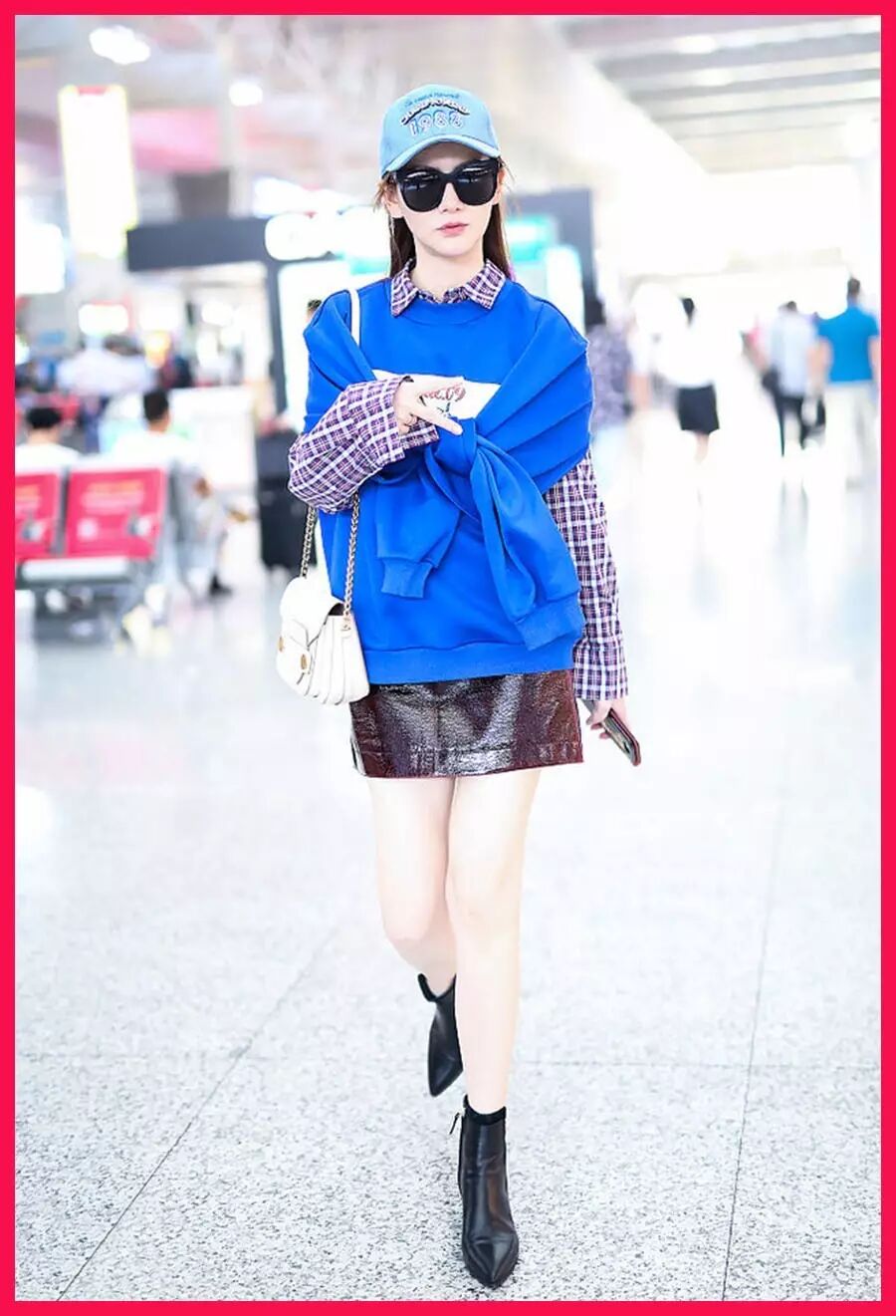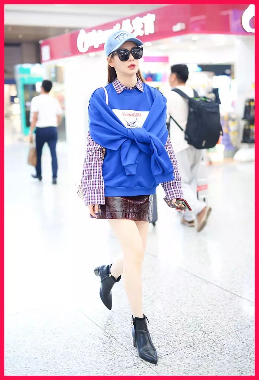 上海,9月4日,戚薇现身机场,她头戴天蓝色字母刺绣鸭舌帽,戴Gentle Monster黑色墨镜,身穿宝蓝色开叉袖印花系扣卫衣,内搭拼色格纹衬衫,肩背Stella McCartney白色链条包,下穿紫红色漆皮短裙,脚踩黑色尖头粗跟短靴。