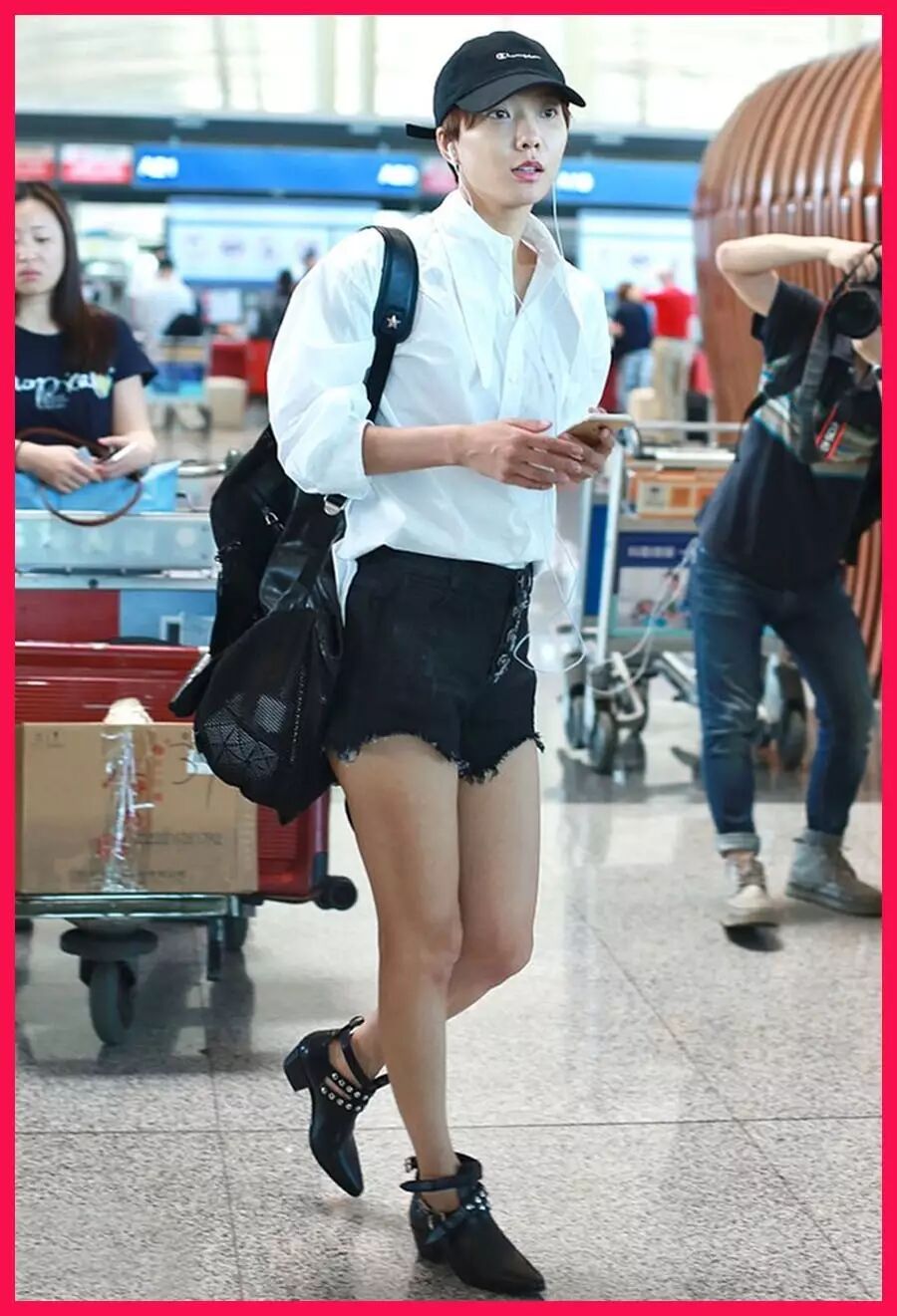 北京,9月5日,王珞丹机场街拍。她戴Champion字母刺绣logo黑色棒球帽,身穿白色口袋衬衣,下身穿五角星金属纽扣黑色高腰牛仔毛边短裤,脚踩铆钉装饰搭扣机车短靴,肩背黑色网面双肩包。