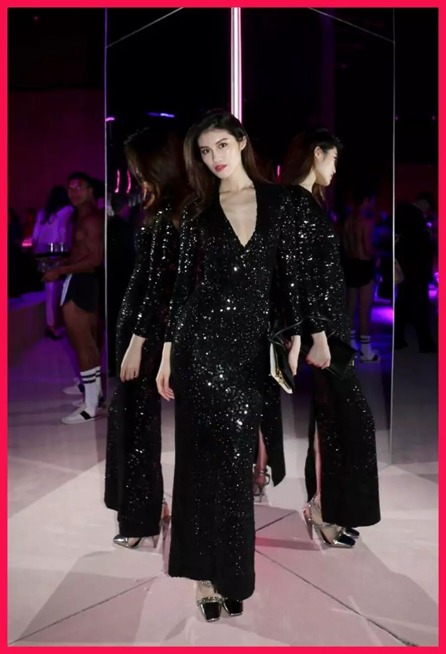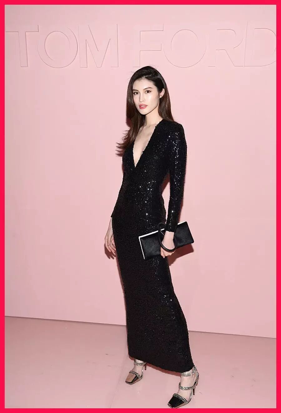 9月6日,纽约,时逢2018春夏纽约时装周,Tom Ford品牌秀场。超模何穗亮相观秀红毯,身穿黑色亮片深V领长袖修身长裙,手拿黑白拼色马海毛手拿包,脚穿银色镜面高跟鞋。