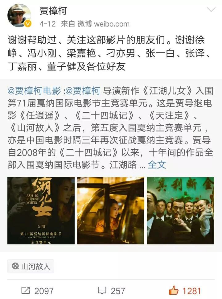 这是继《任逍遥》、《二十四城记》、《山河故人》等作品之后贾樟柯作品第6次入围戛纳电影节(5次主竞赛单元)。贾樟柯导演在个人微博上表达了感谢:“谢谢帮助过、关注这部影片的朋友们。谢谢徐峥、冯小刚、梁嘉艳、刁亦男、张一白、张译、丁嘉丽、董子健及各位好友。”