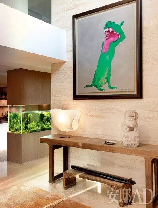 林依轮2007年以200万购得周春芽的《绿狗》,而2010年同系列曾经拍出997万天价,so...你们懂的。左边是特别定制的生态鱼缸,条案下红木琴桌上摆着太太西华练习用的古琴。据说林依轮的太太在家闲着说了句想学古琴,然后北京最好的古琴名家就上门去教了,这家古琴有多值钱呢,就是放在古琴大师家里都舍不得弹,只能摆着的那种。
