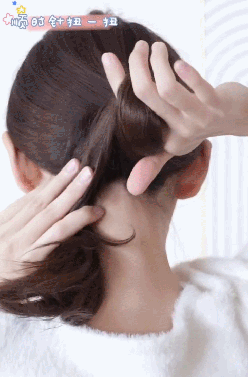 之后再进行旋转缠绕,头发较长的话可以多缠绕两圈,注意做这个动作时不要将头发全部挽上,要留出部分发尾进行毽子头的打造。