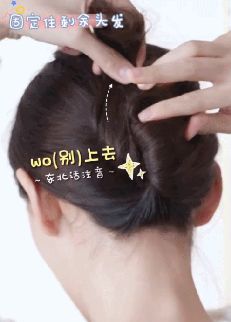 将剩余的发尾贴至刚刚缠好的发鬏处,发尾朝上。