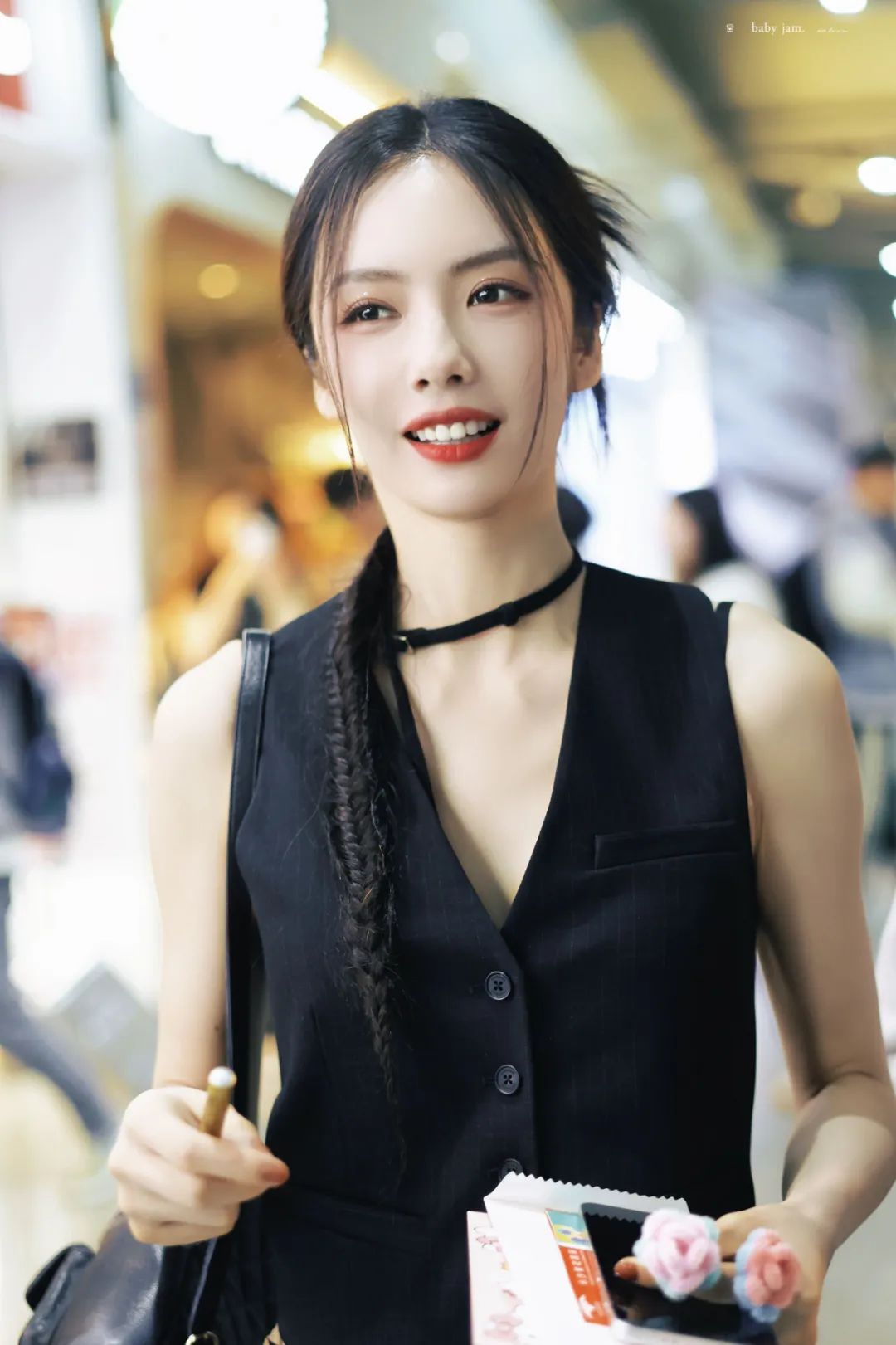 化着小烟熏妆的张婧仪又甜又酷,两侧几缕碎发打破了造型的成熟感,这样的鸡毛毽子头既能平衡面部比例,又能很好地修饰脸型。