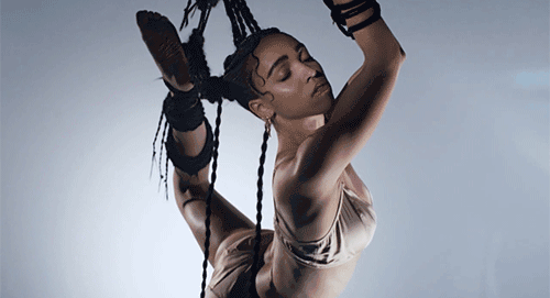 在 《Pendulum》 的 MV,FKA Twigs 大玩捆绑。悬挂在空中,让人叹为观止。虽然很多 其他歌手也会运用 sex 的元素,但给人的感觉就像 “隔靴搔痒”。而 FKA Twigs 则无比直接,歌词让人听得 “欲罢不能”。具体的,还是各位自行领略吧。