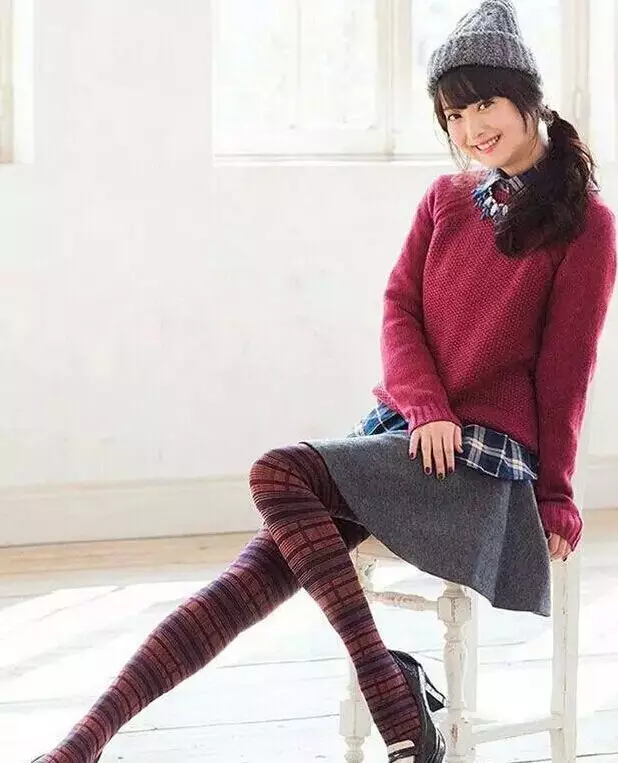 流苏毛衣 红色百褶短裙 碎花连裤袜 绒面搭扣鱼嘴高跟鞋 灰色兔毛帽子