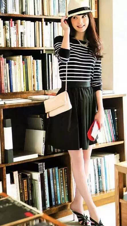 黑白条纹修身长袖T 黑色高腰百褶半身裙 黑色细跟罗马凉拖 白色链条包 白色礼帽