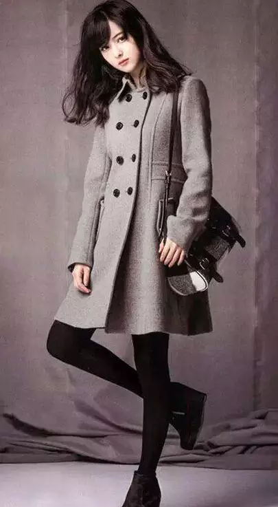 灰色双排扣毛呢大衣 格纹图案单肩贝壳包 绒面坡跟短靴 男欢女爱 加微信号:bk8887 你懂得!